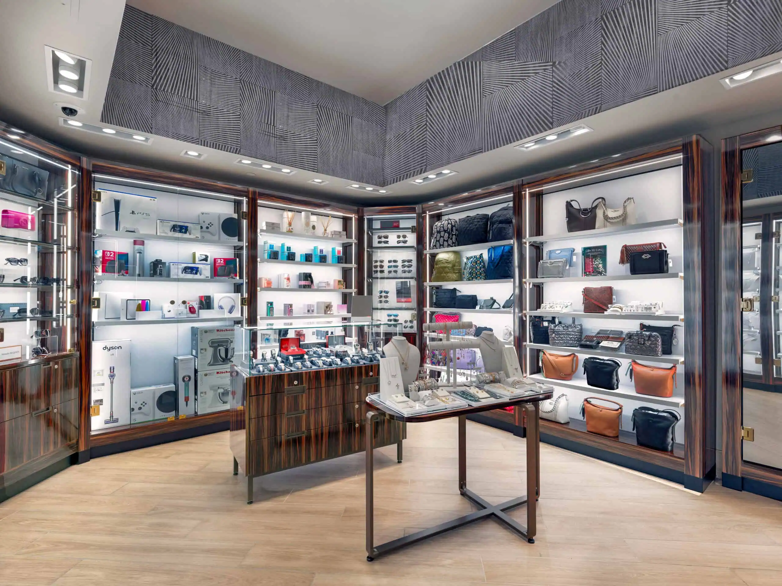 The store features OPTO’s Modular Millwork counters and Shadowboxes incorporating Reveal Tiled Wall, paired with integrated linear lighting to enhance depth, visibility, and overall presentation. Undershelf lighting further highlights merchandise and creates a polished, high-end feel throughout the space. Evolve floor fixtures provide flexibility on the sales floor, while custom showcases introduce refined focal points for featured products.
