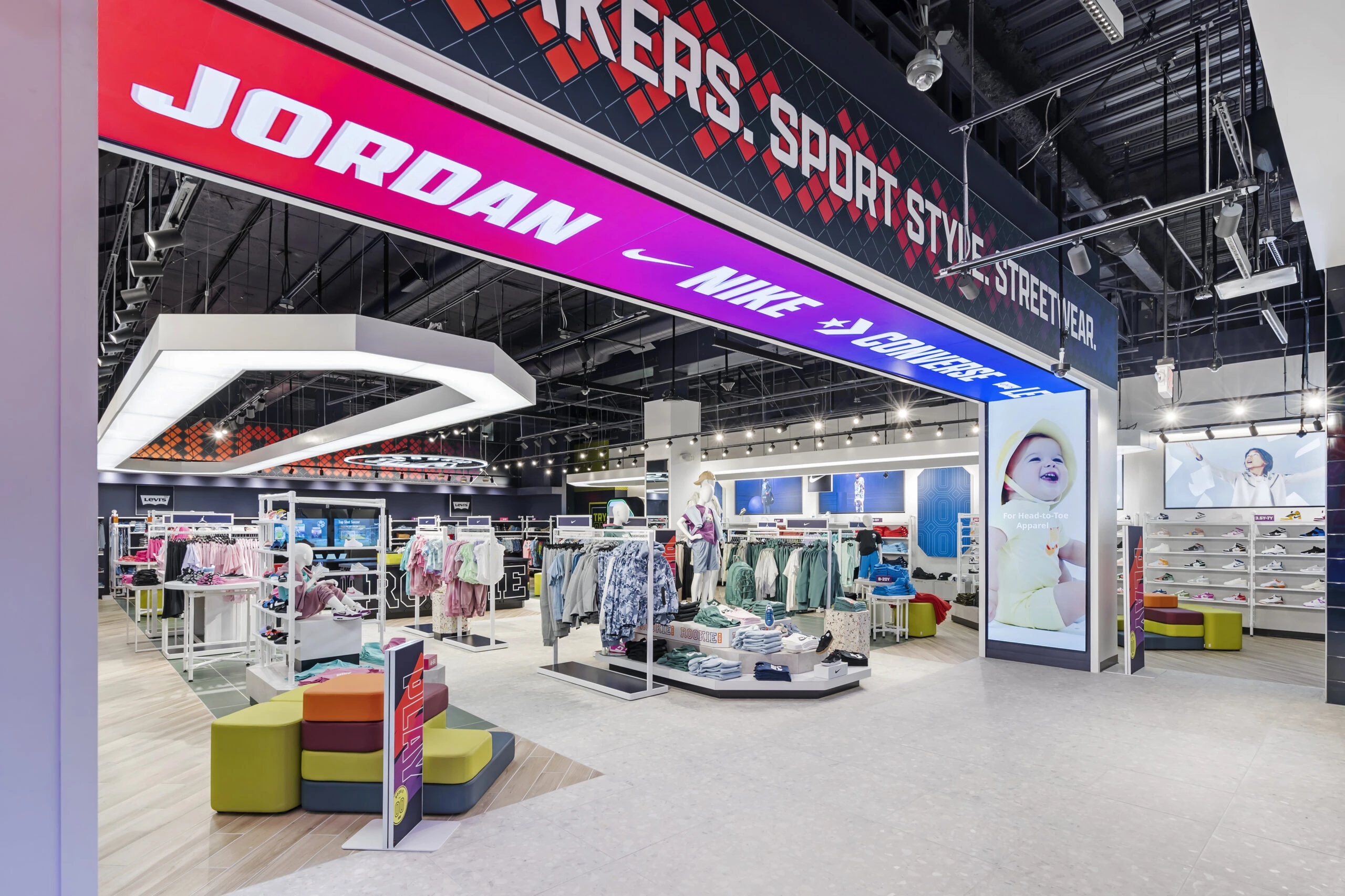Our semi-custom fixtures showcase brands like Nike, Jordan, and Converse in an engaging retail environment. The design includes dynamic floor displays, adaptable wall systems, and striking focal units, all enhanced by vibrant signage and graphics.